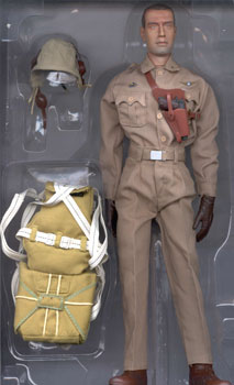 Figur Ben, zwei Paar Hände (mit und ohne Handschuhe) Ständer, Uniform bestehend aus Jacke (mit 3 Abzei- chen) & Hose, Schnürstiefel, Gürtel, Schiffchen, Flieger- haube, Seidenschal mit eingesticktem chinesischen Schriftzeichen, Lederjacke mit 4 Abzeichen, drei Aufnähern (zwei davon innen), Fliegerbrille, Armband- uhr, Fallschirm mit Gurtzeug und ein Schulterholster mit Pistole und herausnehmbarem Magazin. |