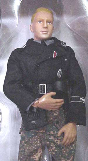 Figur Fritz, Ständer, schwarze Uniformjacke und eine bräunliche Tarnmusterhose, blaues Oberhemd mit Schlips, Halbstiefel, Gürtel,
