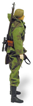 Kapuze. Gürtel, mit zwei Munitionstaschen, schwarze Stiefel, ein Fern- glas eine Feldflasche und ein Mosin-Nagant M1891/30 Scharfschützengewehr mit Zielfernrohr.